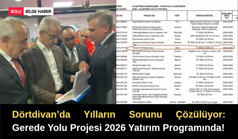 Dörtdivan Belediye Başkanı Hamza Efe, ilçenin ulaşım standartlarını kökten değiştirecek müjdeyi verdi. Yıllardır çözüm bekleyen Dörtdivan-Gerede yolu, genişletme ve yenileme çalışmaları kapsamında Ulaştırma ve Altyapı Bakanlığı’nın 2026 yatırım programına dahil edildi.
