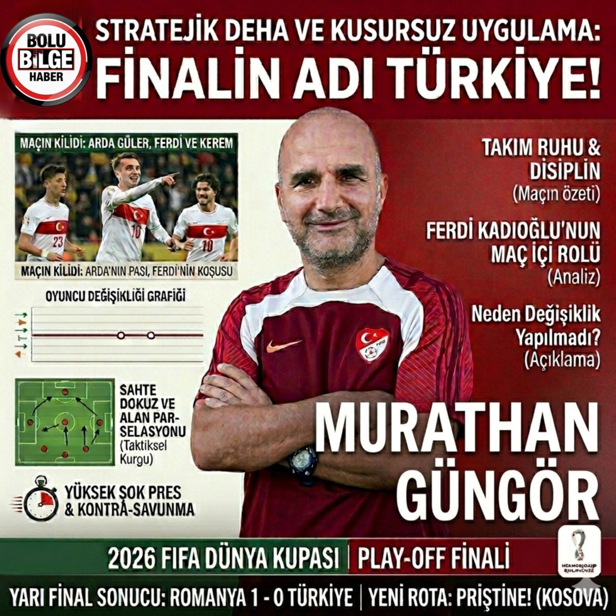 Milli Takımımız, 2026 Dünya Kupası Play-off yarı finalinde Romanya’yı 1-0 mağlup ederek finalde Kosova’nın rakibi oldu. Sahadaki 11’in birbirini bir yapboz parçası gibi tamamladığı gecede, taktiksel disiplin galibiyeti getirdi.